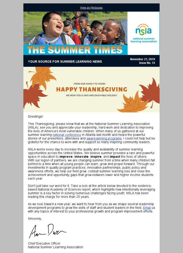 This Thanksgiving, please know that we at the National Summer Learning Association (NSLA), see you and appreciate your leadership, hard workand dedication to improving the lives of America’s most vulnerable children.When many of us gathered at our summer learningnational conferencein Atlanta last month and heard the powerful stories of our presenters, attendees andaward-winning programs. NSLA […]