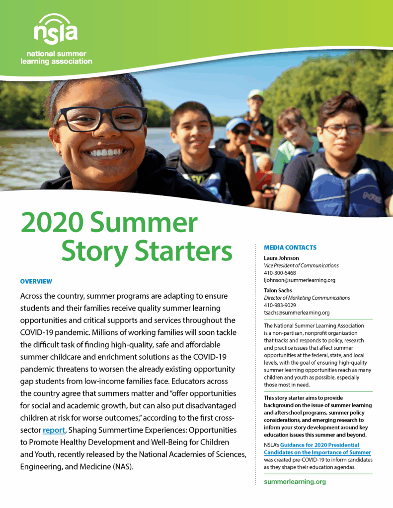 This story starter aims to provide background on the issue of summer learning and afterschool programs, summer policy considerations, and emerging research to inform your story development around key education issues this summer and beyond. NSLA’s Guidance for 2020 Presidential Candidates on the Importance of Summer was created pre-COVID-19 to inform candidates as they shape their education agendas.