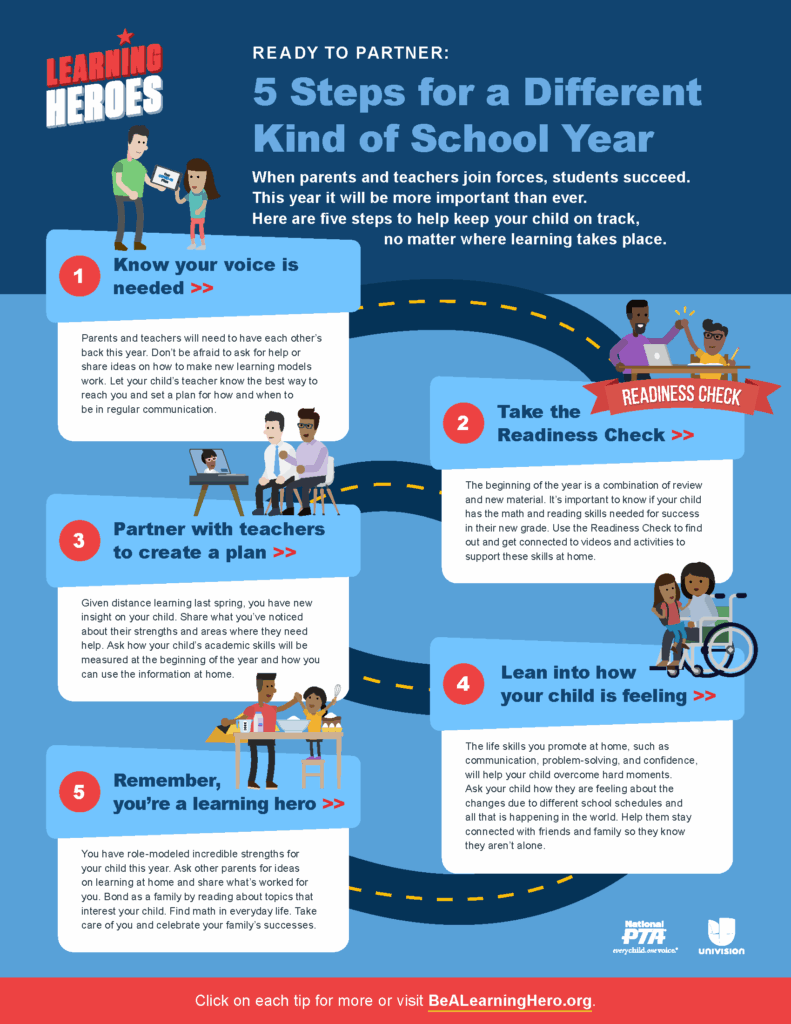 When parents and teachers join forces, students succeed. This year it will be more important than ever. Here are five steps to help keep your child on track, no matter where learning takes place:
