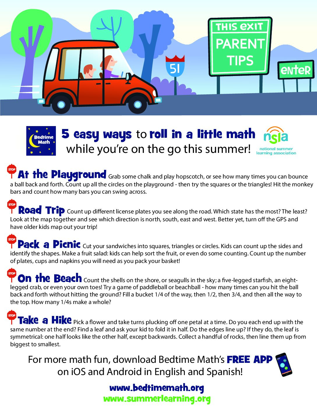 Math at the playground, during a road trip, while packing a picnic, on the beach, or while taking a hike.