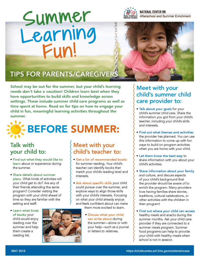 A companion tip sheet is also available from NCASE: Summer Learning Fun! Tips for Parents/Caregivers. This tip sheet provides concrete ideas for parents and caregivers around how to engage their children in fun, meaningful learning activities throughout the summer. Summertime child care providers can share this tip sheet with families to further support summer learning and enrichment experiences for the children they serve.